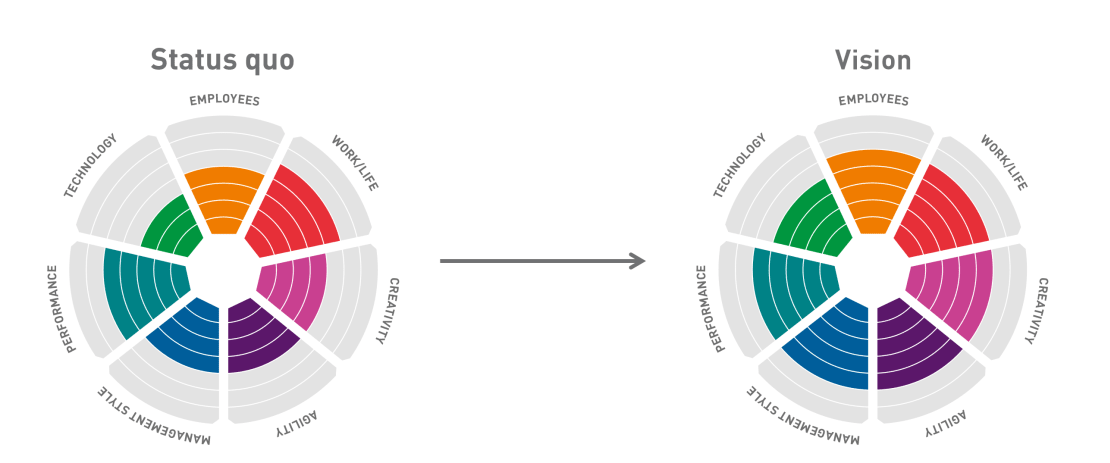 Every company is characterised by its own specific work culture. König + Neurath has developed an analysis tool to find out the qualities of this individual culture: with the help of the K+N WORK.CULTURE.MAP you can discover your company’s status quo across seven dimensions – technology, management style, employee structure, work-life, creativity, performance and agility. On the basis of the information gathered, we visualise your work culture and transform the results into inspiration for designing your working environments. With deeper analysis and workshops we can then collaborate with you to develop visions and creative ideas together.