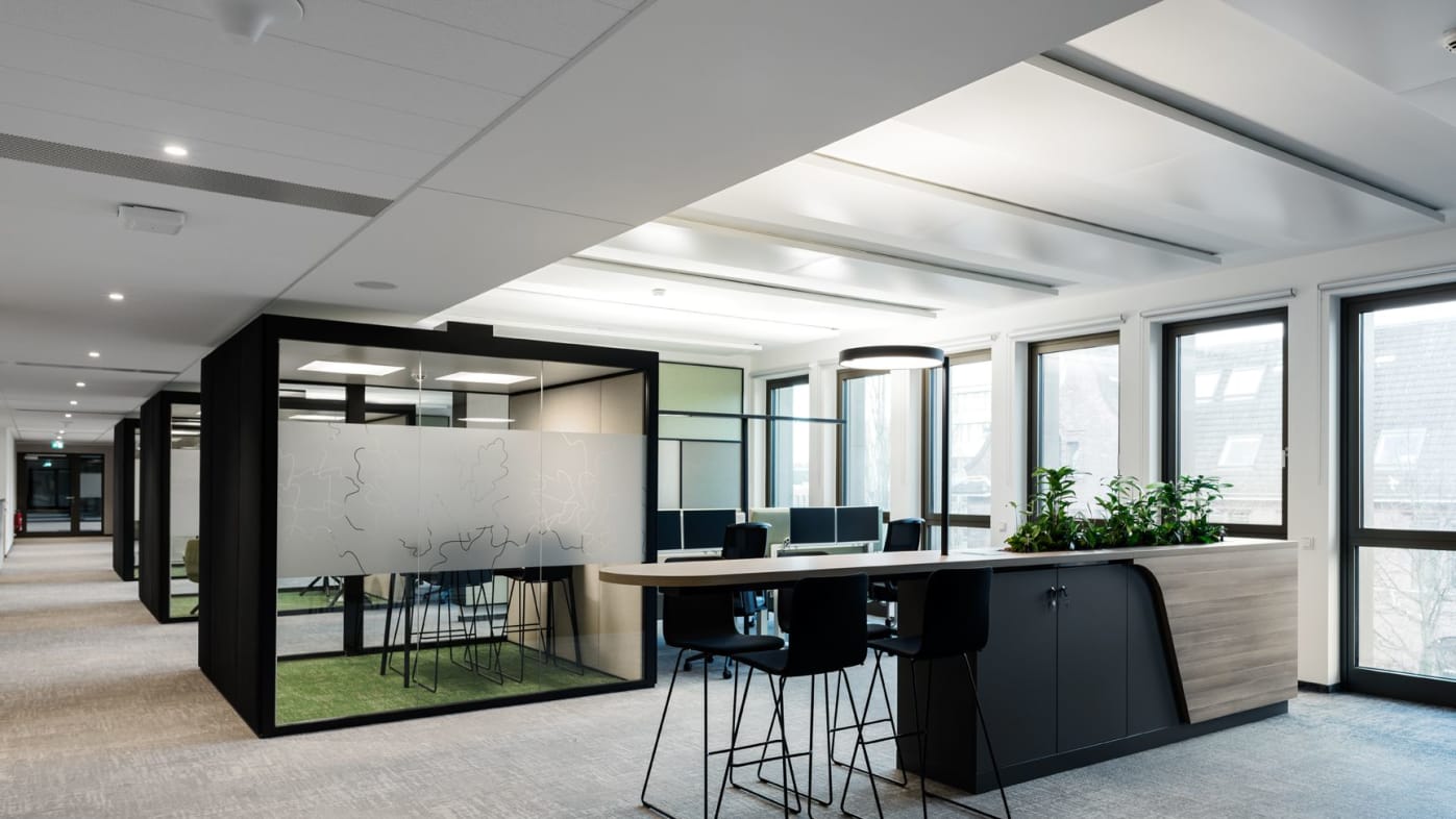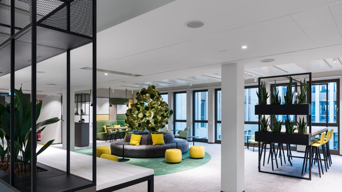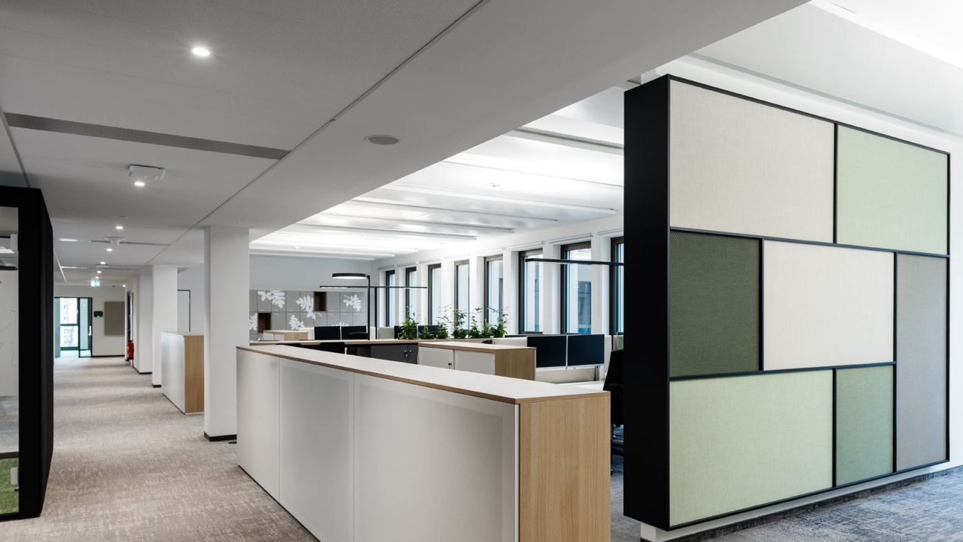 Ook andere vormgevingsaspecten hebben een uitwerking op het samenzijn en de arbeidscultuur. De multispace-structuur heeft tot doel de communicatie te bevorderen, ruimte te maken voor digitalisering en de bedrijfscultuur uit te dragen. Bij de ontwikkeling van de nieuwe werkomgeving speelden factoren als structurele herbezinning, vlakke organisatiestructuren en mobiel resp. flexibel werken een uiterst belangrijke rol. Naast diverse speciale zones met een eigen sfeer en identiteit zorgen additionele werkplekken voor alle medewerkers voor een aantrekkelijke, hoogwaardig vormgegeven werkomgeving en een betere arbeidsorganisatie. König + Neurath leverde Euler Hermes in totaal 80 THINK.TANKs voor werkbesprekingen en vergaderingen. De zwarte aluminiumprofielen van de ruimte-in-ruimte-oplossing ondersteunen het moderne karakter van de ruimtelijke architectuur. Voor de ergonomische inrichting van de werkplekken droegen de productontwikkelaars uit Karben motorisch in hoogte verstelbare TALO.S tafels met flyby-panelen als zichtscherm bij. De blokken van 4 worden aangevuld met JET.II bureaustoelen en ladenblokken. ACTA.PLUS opbergelementen met akoestisch werkzame fronten bieden niet alleen voldoende ruimte, maar zorgen tegelijkertijd voor de zonering van de kantoorruimte. Samen met een evenwichtige combinatie van biofiele kleuren, vormen, structuren en het gebruik van planten wordt de natuur op diverse manieren in de ruimteconcepten geïntegreerd en zorgt zij en passant voor een optimale oriëntatie in het gebouw.