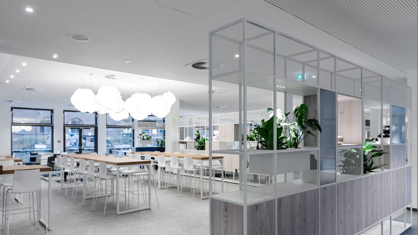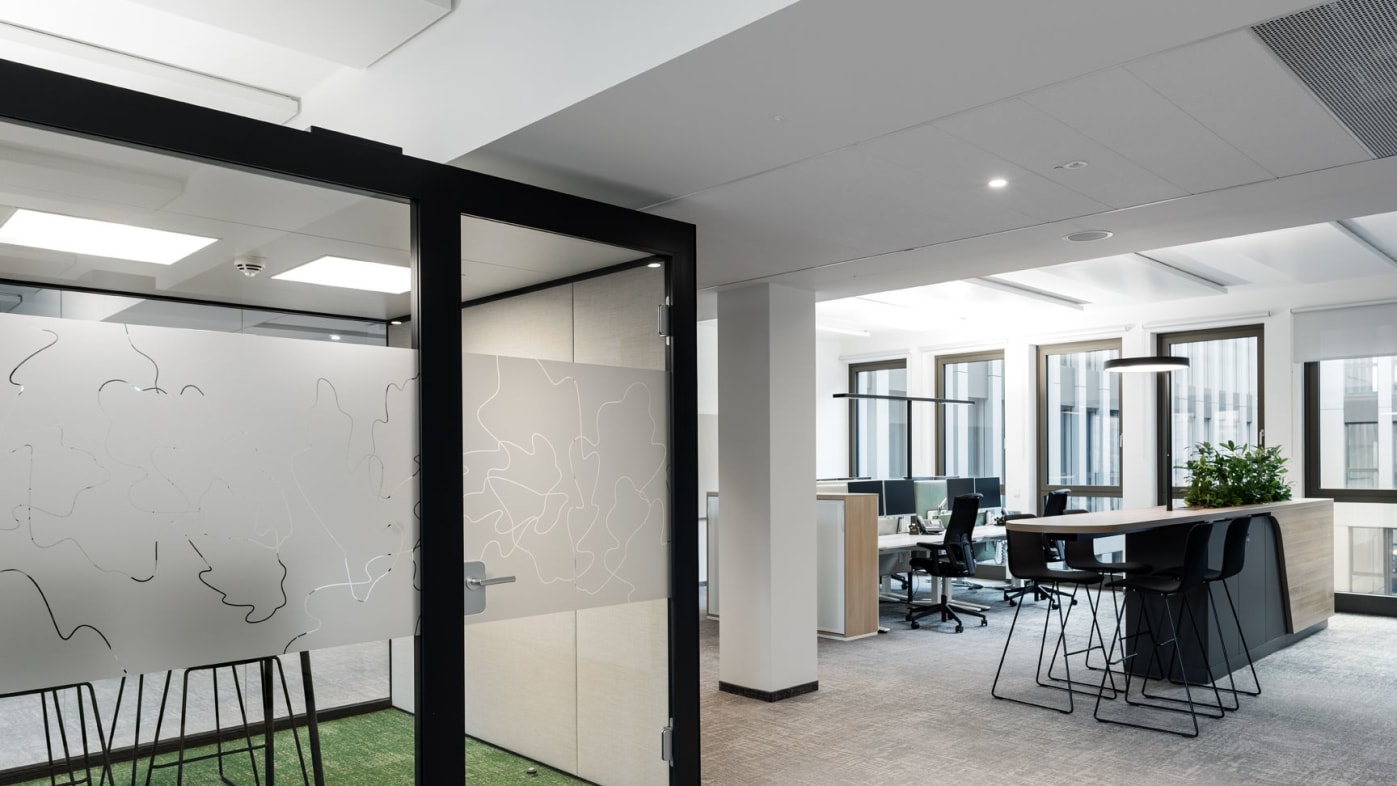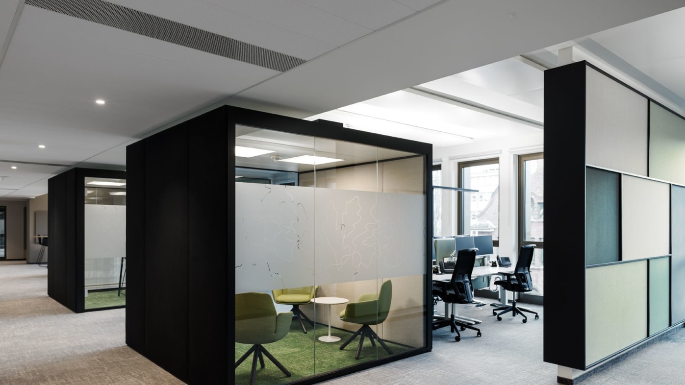 Ook andere vormgevingsaspecten hebben een uitwerking op het samenzijn en de arbeidscultuur. De multispace-structuur heeft tot doel de communicatie te bevorderen, ruimte te maken voor digitalisering en de bedrijfscultuur uit te dragen. Bij de ontwikkeling van de nieuwe werkomgeving speelden factoren als structurele herbezinning, vlakke organisatiestructuren en mobiel resp. flexibel werken een uiterst belangrijke rol. Naast diverse speciale zones met een eigen sfeer en identiteit zorgen additionele werkplekken voor alle medewerkers voor een aantrekkelijke, hoogwaardig vormgegeven werkomgeving en een betere arbeidsorganisatie. König + Neurath leverde Euler Hermes in totaal 80 THINK.TANKs voor werkbesprekingen en vergaderingen. De zwarte aluminiumprofielen van de ruimte-in-ruimte-oplossing ondersteunen het moderne karakter van de ruimtelijke architectuur. Voor de ergonomische inrichting van de werkplekken droegen de productontwikkelaars uit Karben motorisch in hoogte verstelbare TALO.S tafels met flyby-panelen als zichtscherm bij. De blokken van 4 worden aangevuld met JET.II bureaustoelen en ladenblokken. ACTA.PLUS opbergelementen met akoestisch werkzame fronten bieden niet alleen voldoende ruimte, maar zorgen tegelijkertijd voor de zonering van de kantoorruimte. Samen met een evenwichtige combinatie van biofiele kleuren, vormen, structuren en het gebruik van planten wordt de natuur op diverse manieren in de ruimteconcepten geïntegreerd en zorgt zij en passant voor een optimale oriëntatie in het gebouw.