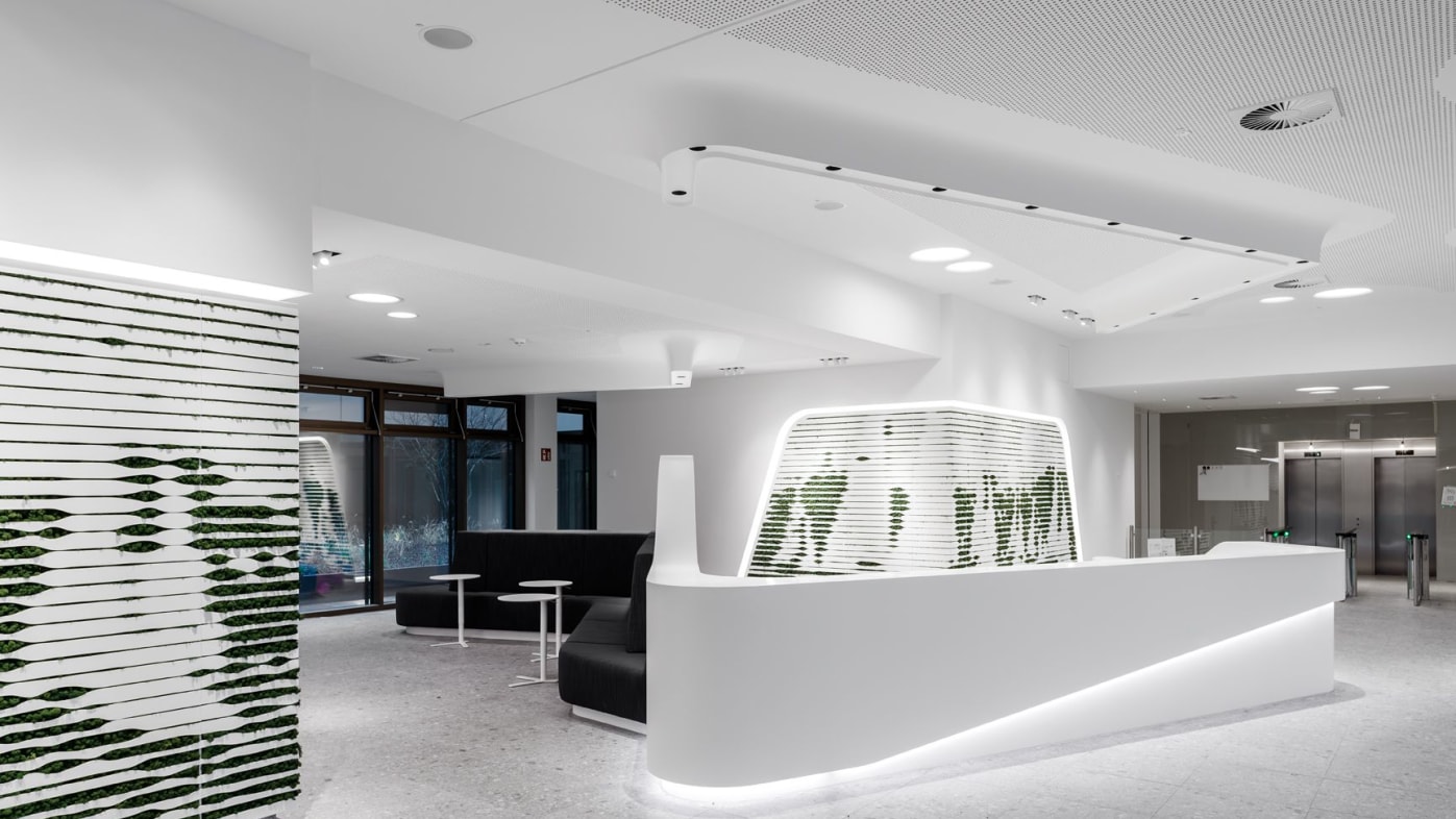 Wie het nieuwe Duitse hoofdkantoor van kredietverzekeraar Euler-Hermes betreedt, merkt: ik ben in de toekomst aanbeland. Met royale organische vormen, een geraffineerd gebruik van planten en een gedurfde lijnvoering wordt men bijna hypnotisch het gebouw ingezogen. “Emotie speelt bij onze concepten altijd een belangrijke rol. Ons primaire doel is om binnenruimten een eigen, ‘leesbare’ identiteit te geven: identificatie, oriëntatie, herkenbaarheid en differentiatie zijn de sleutelbegrippen”, aldus Kim Marc Bobsin van sbp, het Hamburgse adviesbureau dat verantwoordelijk is voor de interieurvormgeving.